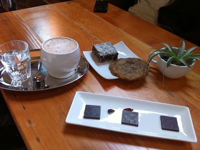 East Van Roasters is a beautiful little production cafe located in Gastown. Both coffee beans and cacao beans are roasted on site, and single-origin chocolates and drinking chocolates are produced there as well. I enjoyed sharing a tasting flight of single origin chocolates, a Mayan Spice drinking chocolate, a salted chocolate chip cookie and a “Good Bar” (a fabulous raw brownie of cacao, coconut, nuts and seeds), oh yes, and a coffee. Sometimes you just have to try it all.